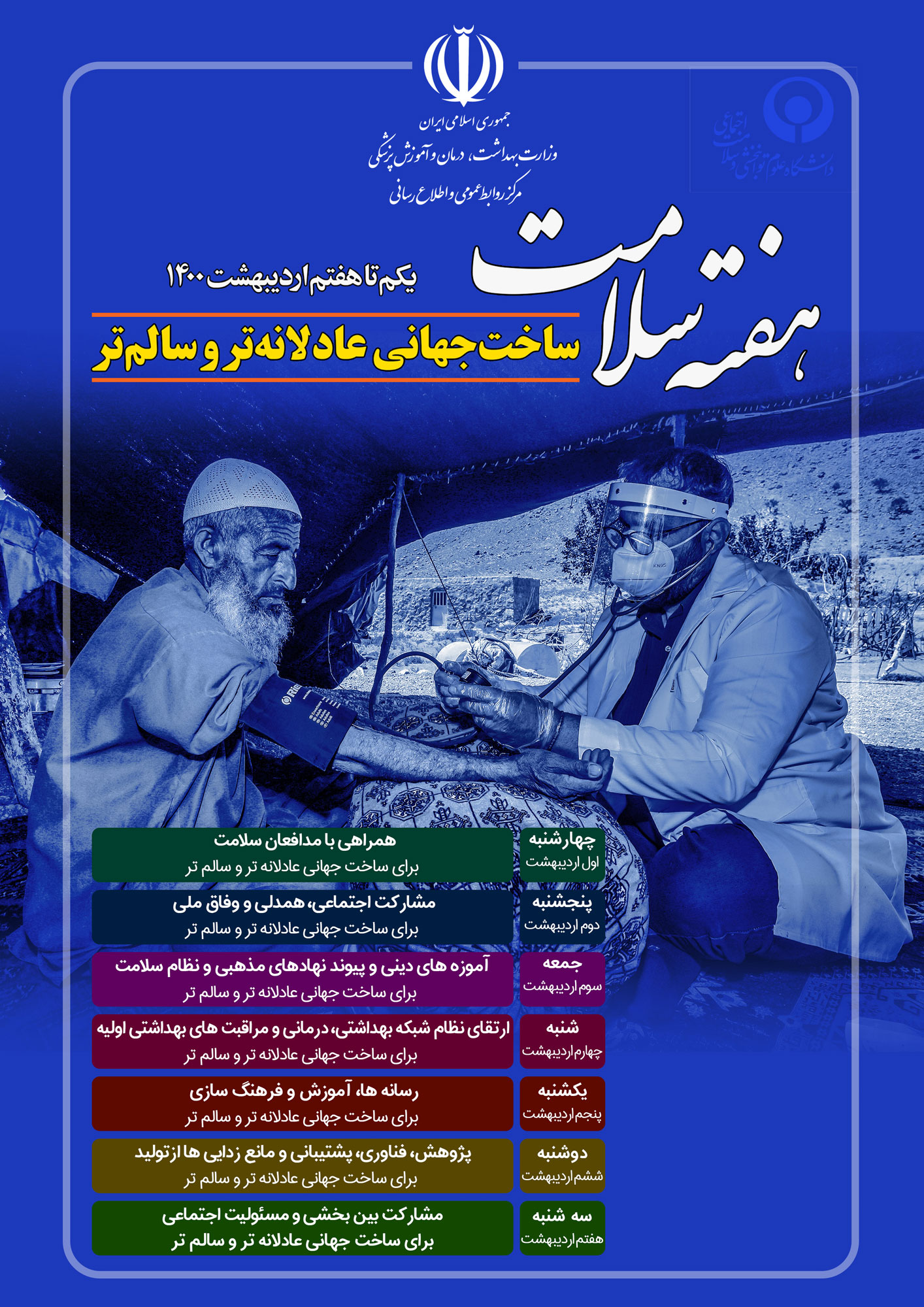 هفته سلامت، بهانه ای برای سپاسگزاری و گفتن " خداقوت " به سفیدپوشان خط مقدم جبهه مرگ و زندگی، به کادر درمان در مراکز درمانی سراسر کشور تا سپیدپوشان در مراکز تحت پوشش دانشگاه علوم توانبخشی و سلامت اجتماعی است، ضمن اینکه، برای تک تک این عزیزان، آرزوی سلامتی و توفیق روزافزون جهت حرکت در مسیر سبز خدمت را دارم.