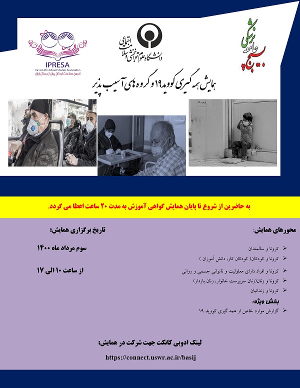 همایش « همه گیری کووید 19 و گروه های آسیب پذیر »، به همت بسیج جامعه پزشکی دانشگاه علوم توانبخشی و سلامت اجتماعی و با همکاری اعضای هیات علمی گروه های مختلف آموزشی این دانشگاه و انجمن مطالعات کودکان پیش از دبستان ایران، از ساعت 10 الی 17 روز سوم مردادماه امسال برگزار می شود.